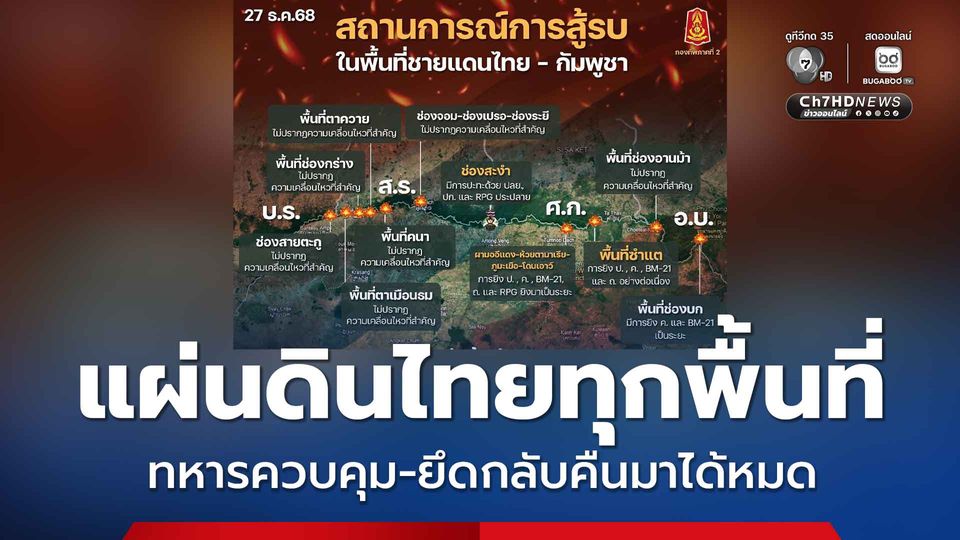 กองทัพภาคที่ 2 สรุปสถานการณ์ชายแดนไทย–กัมพูชา ทหารไทยควบคุมได้ทั้งหมดทุกพื้นที่ ที่เป็นพื้นที่ของประเทศไทยที่ยึดคืนกลับมาได้