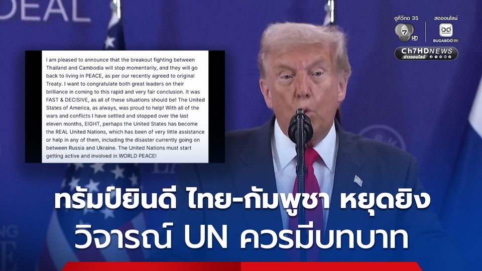 ประธานาธิบดี โดนัลด์ ทรัมป์ แห่งสหรัฐฯ โพสต์แสดงความยินดี ไทย-กัมพูชา หยุดยิง คุย สหรัฐฯ ช่วยยุติสงครามหลายภูมิภาค ขณะที่สหประชาติควรต้องมีบทบาทในการสร้างสันติภาพ มากกว่านี้