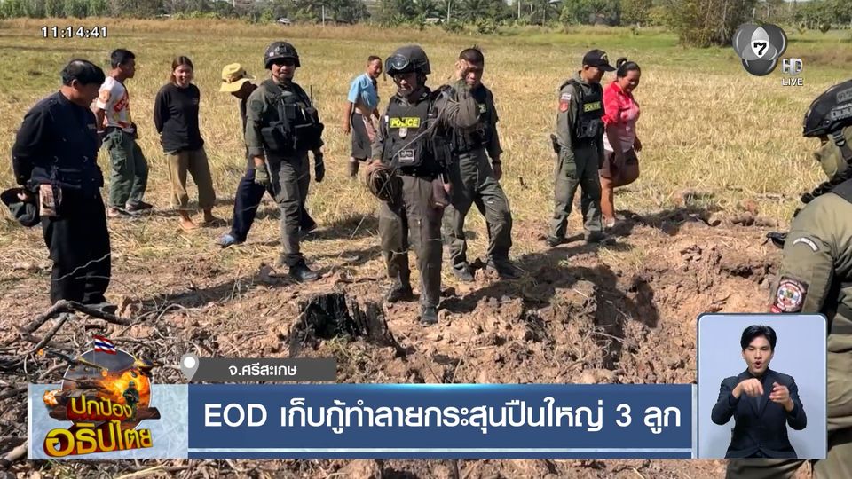 ห้องข่าวภาคเที่ยง - เจ้าหน้าที่ชุด EOD เร่งสำรวจพื้นที่ ใน อำเภอกันทรลักษ์ จังหวัดศรีสะเกษ เพื่อเก็บกู้ทำลายวัตถุระเบิดที่ตกอยู่ในชุมชน เพื่อให้ชาวบ้านกลับมาใช้ชีวิตปกติ ซึ่งเมื่อวานนี้เจ้าหน้าที่เก็บกู้ทำลายได้ทั้งหมด 3 ลูก