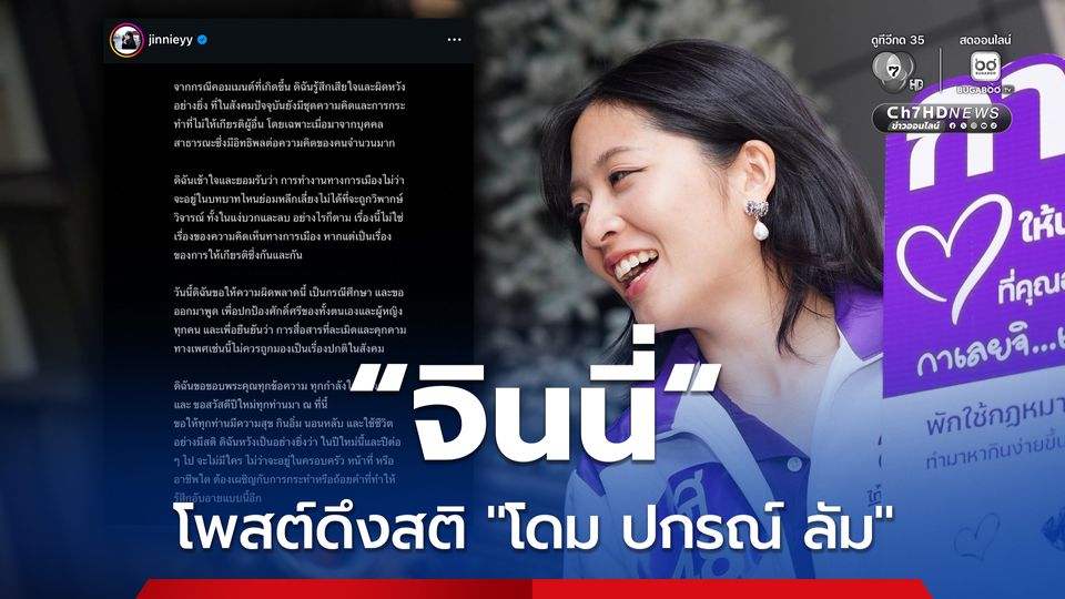 วันนี้ (30 ธ.ค. 68) น้องจินนี่ ยศสุดา ลีลาปัญญาเลิศ ลูกสาวคุณหญิงสุดารัตน์ เกยุราพันธ์ แคนดิเดตนายกฯ พรรคไทยสร้างไทย ได้โพสต์เคลื่อนไหวครั้งแรกหลังถูก "โดม ปกรณ์ ลัม" นักร้องดังเข้ามาคอมเมนต์คุกคามทางเพศ