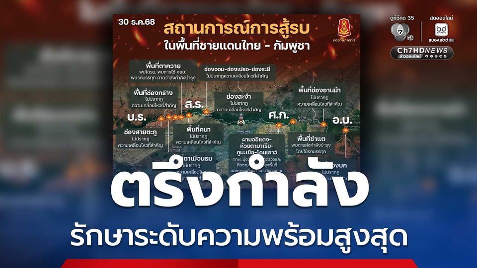 กองทัพภาคที่ 2 สรุปสถานการณ์ ชายแดนไทย–กัมพูชา วันที่ 30 ธ.ค. ในพื้นที่ยังคงมีการตึงกำลัง ฝ่ายกัมพูชาเสริมที่มั่น–ส่งกำลังบำรุงต่อเนื่อง หลังพ้นหยุดยิง 72 ชม. “ไทยเรายังจำเป็นต้องรักษาระดับความพร้อมสูงสุด มีความชัดเจนในการวางกำลัง และเพิ่มความระมัดระวัง ต่อการตีความสถานการณ์ ที่อาจนำไปสู่ความเข้าใจคลาดเคลื่อนและการปะทะโดยไม่ตั้งใจ”