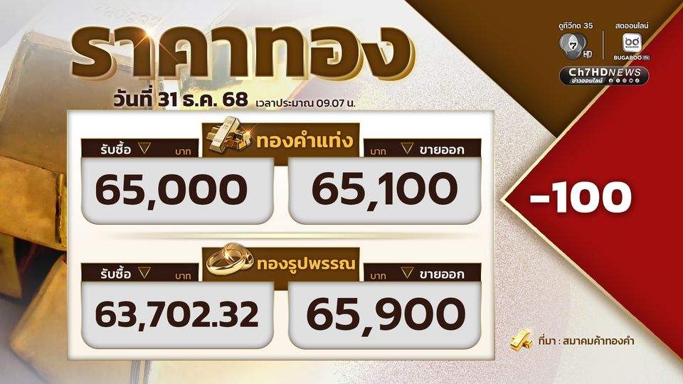 ราคาทอง โดยสมาคมค้าทองคำ รายงานราคาทองวันนี้ (31 ธ.ค. 68) เปิดตลาดราคาทอง ราคาทองปรับลง 100 ขายออกที่บาทละ 65,100 บาท โดยทองคำแท่งรับซื้อที่ 65,000 บาท ขายออกที่ 65,100 บาท ทองรูปพรรณรับซื้อที่ 63,702.32 บาท ขายออก 65,900 บาท