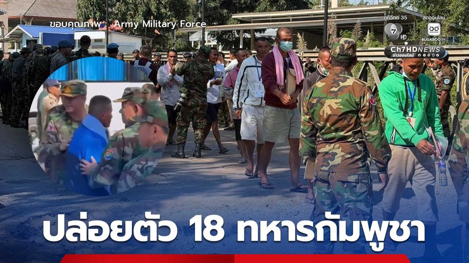 ปล่อยตัวแล้ว 18 ทหารกัมพูชา ส่งตัวกลับทางด่านไพลิน ตรงข้ามด่านบ้านผักกาด จ.จันทบุรี