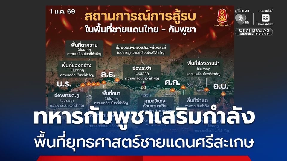 วันนี้ (2 ม.ค. 69) กองทัพภาคที่ 2 สรุปสถานการณ์ชายแดนไทย–กัมพูชา ภาพรวมสถานการณ์ประจำวันที่ 1 ม.ค. 69 ว่า โดยทั่วไปยังไม่เกิดการปะทะด้วยอาวุธหรือเผชิญหน้าโดยตรง แต่ฝ่ายตรงข้ามยังคง เสริมกำลังและเตรียมความพร้อมเชิงยุทธการอย่างต่อเนื่อง