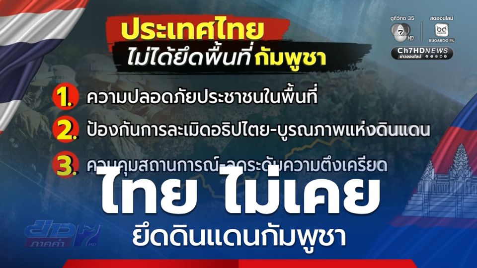 ข่าวภาคค่ำ - ประเทศไทย ยืนยัน หนักแน่น ไม่เคยยึดดินแดนของกัมพูชา ตามที่สื่อต่างประเทศบางสำนักรายงาน เพียงเดินหน้าทวงดินแดนของตัวเองคืนตามสิทธิที่มีอยู่