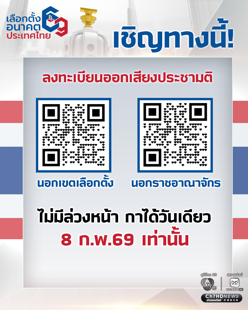 เริ่มแล้ววันแรก (3 ม.ค.69) สำนักงานคณะกรรมการการเลือกตั้ง (กกต.) เปิดลงทะเบียนออกเสียงประชามติ แบบนอกเขตเลือกตั้ง และ นอกราชอาณาจักร ผ่านระบบออนไลน์ เพื่อไปใช้สิทธิในวันที่ 8 ก.พ.69 เพียงวันเดียวเท่านั้น ผ่านเว็บไซต์ หรือ คิวอาร์โคด ที่กำหนด โดยจะเปิดรับลงทะเบียนระหว่าง 3-5 ม.ค.นี้ เพียง 3 วันเท่านั้น