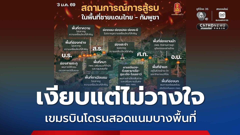 วันนี้ (4 ม.ค.69) กองทัพภาคที่ 2 ได้สรุปสถานการณ์ บรรยากาศตลอดแนวชายแดนไทย–กัมพูชา วานนี้ ( 3 ม.ค.69) ยังคงอยู่ในภาวะ “สงบเชิงยุทธการ แต่ตึงเชิงความมั่นคง” ไม่ปรากฏการปะทะด้วยอาวุธหนักหรือการตอบโต้โดยตรง หากแต่ทั้งสองฝ่ายยังเดินเกมระมัดระวัง เสริมที่มั่น เตรียมพร้อมกำลัง และจับตาความเคลื่อนไหวกันอย่างใกล้ชิด