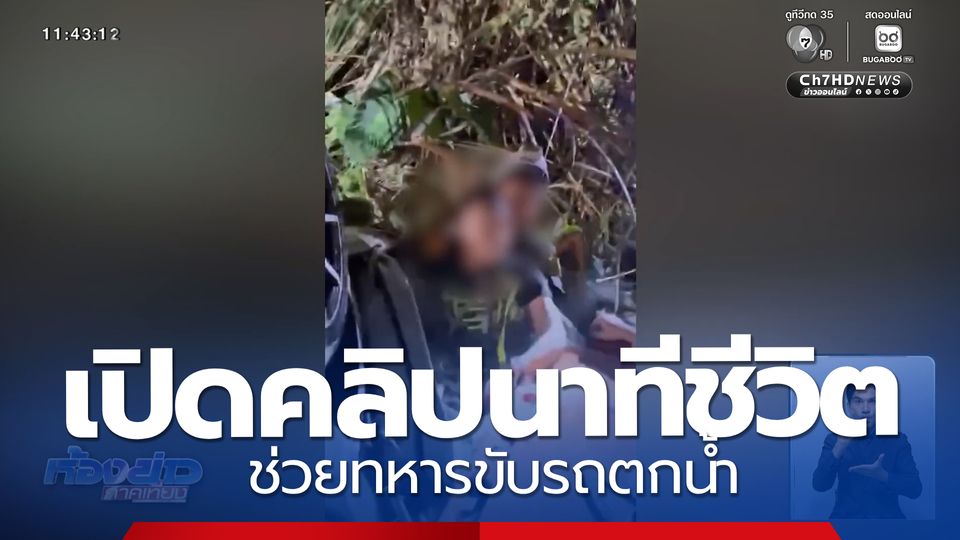ห้องข่าวภาคเที่ยง - เปิดคลิปนาทีชีวิต ที่เจ้าหน้าที่กู้ภัย ลุยน้ำ ทุบกระจก งัดประตูรถ ช่วยทหารขับรถเก๋งพลิกคว่ำตก ลงไปในคูน้ำข้างทาง จมมิดคัน