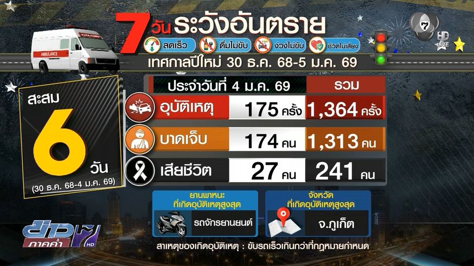 โดยเมื่อวานนี้ 4 มกราคม พบว่า เกิดอุบัติเหตุ 175 ครั้ง มีผู้บาดเจ็บ 174 คน และเสียชีวิต 27 คน ทำให้ยอดสะสม 6 วัน ตั้งแต่วันที่ 30 ธันวาคม 2568 ถึง 4 มกราคม 2569 เกิดอุบัติเหตุสะสม 1,364 ครั้ง มีผู้บาดเจ็บสะสม 1,313 คน และเสียชีวิตสะสม 241 คน สำหรับยานพาหนะที่เกิดอุบัติเหตุสูงสุด คือ รถจักรยานยนต์ จังหวัดที่เกิดอุบัติเหตุสูงสุด ได้แก่ จังหวัดภูเก็ต สาเหตุการเกิดอุบัติเหตุ ขับรถเร็วเกินกว่ากฎหมายกำหนด