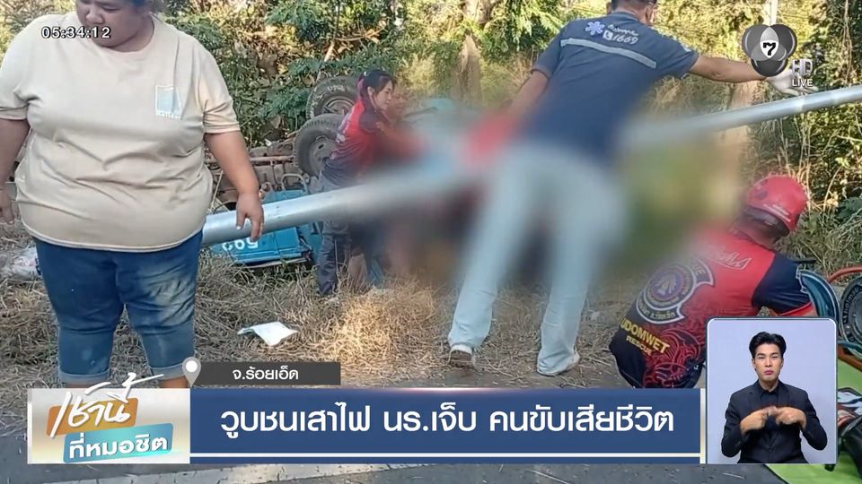 เช้านี้ที่หมอชิต - สลดรับปีใหม่ คนขับรถรับ-ส่งนักเรียน เกิดอาการวูบ รถเสียหลักพุ่งลงข้างทาง ชนเสาไฟส่องสว่าง ก่อนเพลิงลุกไหม้