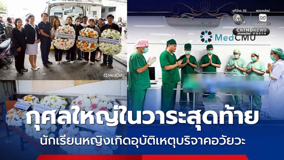 กุศลครั้งยิ่งใหญ่ในวาระสุดท้าย นักเรียนหญิงอายุ 18 ปี ประสบอุบัติเหตุเสียชีวิต บริจาคอวัยวะ หัวใจ ตับ ไต 2 ข้าง กระจกตา 2 ข้าง และ กระดูก ต่อโอกาสการรอดชีวิตให้เพื่อนมนุษย์ผู้ที่รอคอย