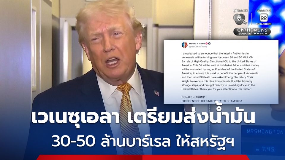 วันนี้ (7 ม.ค. 69) ประธานาธิบดี โดนัลด์ ทรัมป์ แห่งสหรัฐฯ ได้ประกาศผ่าน ทรูธโซเชียล (Truth Social) เมื่อวันอังคาร (6 ม.ค. 69) ว่า ข้าพเจ้ามีความยินดีที่จะประกาศว่า คณะรัฐบาลรักษาการในเวเนซุเอลา จะส่งมอบน้ำมันคุณภาพสูงที่อยู่ภายใต้มาตรการคว่ำบาตรจำนวนระหว่าง 30 - 50 ล้านบาร์เรล ให้แก่สหรัฐอเมริกา ซึ่งน้ำมันเหล่านี้จะถูกจำหน่ายในราคาตลาดและเงินที่ได้นั้นจะอยู่ภายใต้การควบคุมของข้าพเจ้า