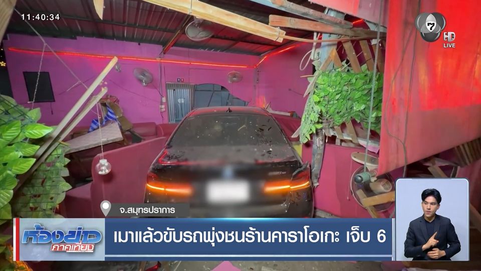 ห้องข่าวภาคเที่ยง - ชายอายุ 53 ปี ซิ่งรถยนต์หรูเสียหลักพุ่งชนร้านคาราโอเกะ ริมถนนที่จังหวัดสมุทรปราการ ลูกค้ากำลังดื่มด่ำกับบรรยากาศในร้าน ได้รับบาดเจ็บ พร้อมพนักงานในร้าน รวม 6 คน ขณะที่คนขับ อ้างมีรถตัดหน้ากะทันหัน