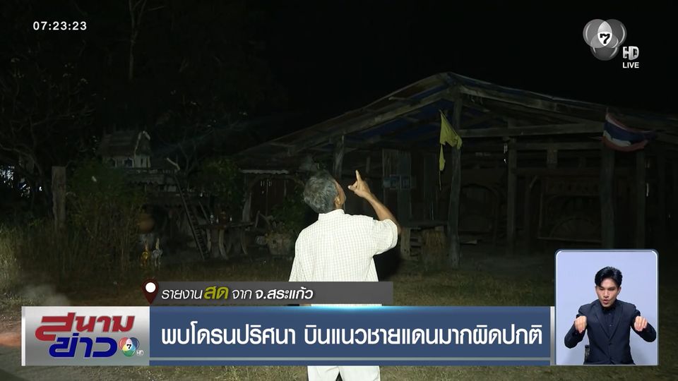 สนามข่าว 7 สี - เมื่อคืนนี้ ชาวบ้านที่ อำเภอตาพระยา จังหวัดสระแก้ว ต้องออกมาดูท้องฟ้าหน้าบ้านช่วงกลางดึก หลังพบว่ามีโดรนปริศนาบินบนท้องฟ้าเหนือหมู่บ้านมากกว่าทุกวัน ทำให้ชาวบ้านเกรงว่าจะมีการปะทะรอบที่ 3 ติดตามจาก คุณหนึ่ง อรรถพล ดวงจินดา รายงานสดจากจังหวัดสระแก้ว