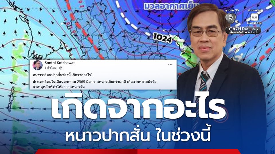หนาวปากสั่น วันนี้ (8 ม.ค.69) ดร.สนธิ คชวัฒน์ นักวิชาการด้านสิ่งแวดล้อมและสุขภาพ ชมรมนักวิชาการสิ่งแวดล้อมไทย ได้โพสต์ข้อความผ่านเฟซบุ๊ก Sonthi Kotchawat ไขคำตอบ หนาว จนปากสั่นช่วงนี้.เกิดจากอะไร โดยระบุว่า ประเทศไทยในเดือนมกราคม 2569 มีอากาศหนาวเย็นกว่าปกติ เกิดจากหลายปัจจัย ซึ่งสาเหตุหลักที่ทำให้อากาศหนาวจัด มีดังนี้