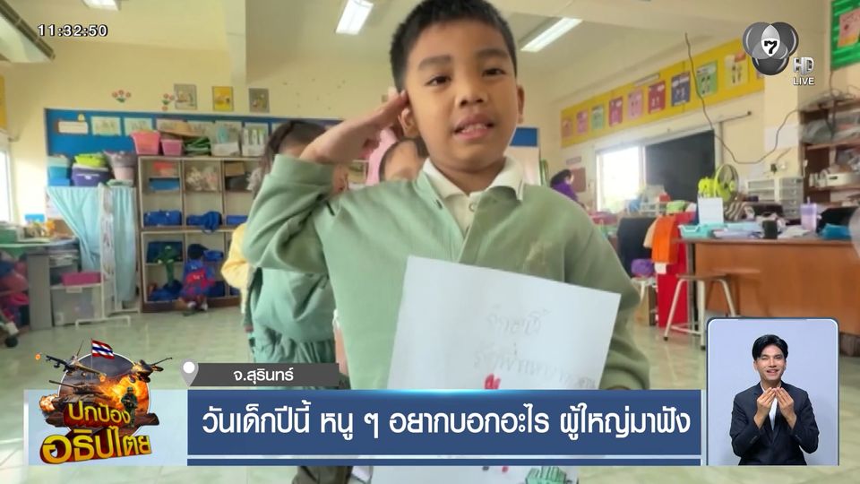 เสียงจากเด็กน้อยชายแดนฝั่งอีสาน จังหวัดสุรินทร์ เสียงที่สดใส พูดให้กำลังพี่ ๆ ทหารแนวหน้า ซึ่งโรงเรียนของน้อง ๆ ก็ได้รับผลกระทบจากเหตุปะทะชายแดนไทย-กัมพูชา จนต้องปิดเรียนชั่วคราว และเพิ่งได้กลับมาเปิดเรียน กำลังจัดกิจกรรมวันเด็กกัน เด็ก ๆ ชื่นชอบพี่ ๆ ทหารมาก ระบายสีและวาดรูป ก็เลือกแต่รูปพี่ทหารและธงชาติไทย