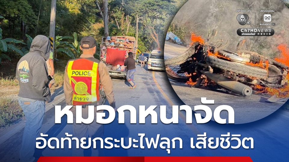 อุบัติเหตุสยอง อากาศหนาวมีหมอกหนาจัด ชายขี่รถ จยย. ชนอัดท้ายรถกระบะจนไฟลุก เสียชีวิตคาที่