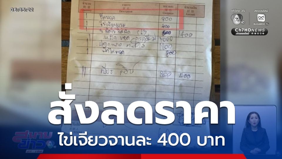 สนามข่าวเสาร์-อาทิตย์ - ดรามาไข่เจียว คราวนี้ที่จังหวัดราชบุรี ไข่เจียวจานละ 400 บาท ที่ร้านค้าแห่งหนึ่งในตลาดน้ำดำเนินสะดวก ลูกค้าไปสั่งอาหารเช็กบิลออกมาแทบช็อก