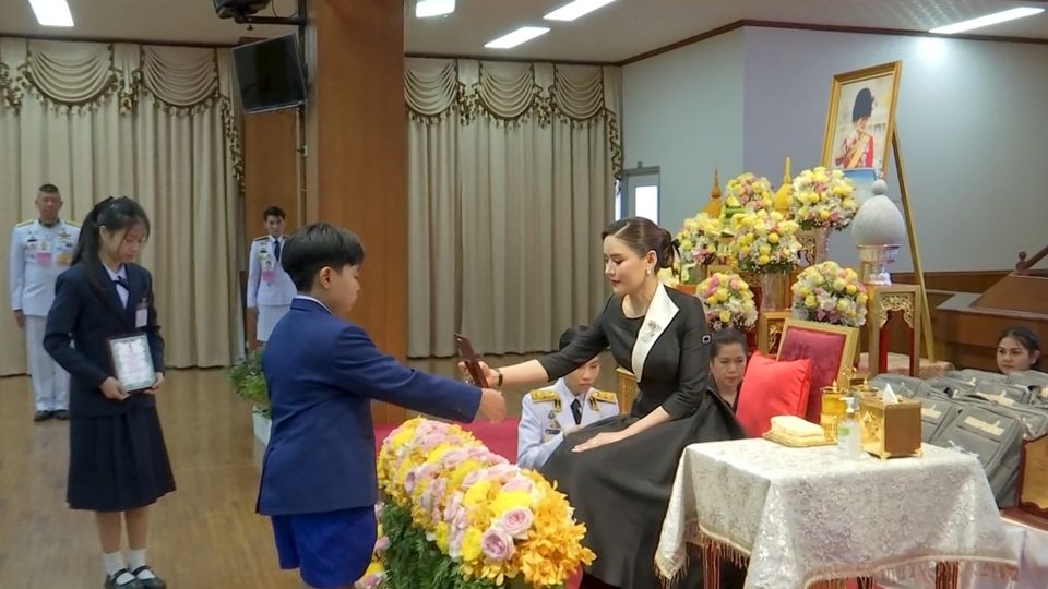 จากนั้น ผู้แทนพระองค์ ไปยังตึกนวมหาราช ในพิธีมอบทุนการศึกษา โล่เกียรติคุณ และกระเป๋าเครื่องเขียนพระราชทานแก่นักเรียนที่มีความประพฤติดี และนักเรียนผู้พิการทางสายตา เนื่องในโอกาสวันเด็กแห่งชาติ ปี 2569 ซึ่งสภาสังคมสงเคราะห์แห่งประเทศไทย ในพระบรมราชูปถัมภ์ โดยคณะกรรมการส่งเสริมพัฒนาเด็กและเยาวชน ได้คัดเลือกเด็กดีเด่น อายุต่ำกว่า 13 ปี จากทั่วประเทศเพื่อมอบทุนการศึกษา โดยจัดขึ้นตั้งแต่ปี 2533 ปัจจุบันได้ร่วมกับภาคีเครือข่ายคัดเลือกเด็กและครอบครัวส่งเสริมคุณธรรมในวัยเด็ก เพื่อยกย่องเชิดชูเกียรติ เป็นแบบอย่างแก่สังคม โดยได้รับการสนับสนุนจากหน่วยงานต่าง ๆ ปีนี้ มีนักเรียนดีเด่น และครอบครัวส่งเสริมคุณธรรมในวัยเด็ก เข้ารับมอบทุนและโล่เกียรติคุณ 42 คน, พระสงฆ์และผู้มีอุปการคุณเข้ารับการถวายและรับมอบโล่เกียรติคุณ 60 รูป/คน, นักเรียนดีเด่น ครอบครัวส่งเสริมคุณธรรมในวัยเด็ก และผู้แทนนักเรียนผู้พิการทางสายตา เข้ารับมอบกระเป๋าเครื่องเขียนพระราชทาน 43 คน