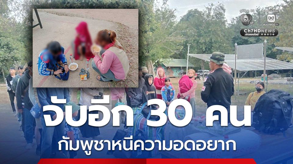 จับอีก 30 คน กัมพูชาหนีความอดอยาก ลักลอบเข้าไทยมาหางานทำ เชื่อสภาพเศรษฐกิจบีบคั้น ทางการไทยดูแลตามหลักมนุษยธรรมจัดหาอาหารน้ำดื่มให้กิน ส่งตัวดำเนินคดี-ผลักดันออกนอกประเทศ
