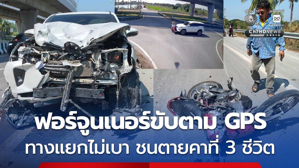 ชายขับรถฟอร์จูนเนอร์มาตามจีพีเอส ถึงทางแยกไม่เบา ชนเต็มแรงหญิงขี่รถ จยย. ซ้อนสาม เสียชีวิตคาที่ 3 ศพ หนึ่งในนี้เป็นหลานสาวอายุเพียง 8 ขวบ