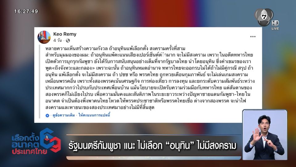หลังจากที่ นายแก้ว เรมี รัฐมนตรีอาวุโสกัมพูชา โพสต์เฟซบุ๊ก การเลือกตั้งในไทยหาก นายอนุทิน ชาญวีรกูล แคนดิเดตนายกรัฐมนตรีพรรคภูมิใจไทย แพ้เลือกตั้ง สงครามก็ไม่เกิดขึ้น