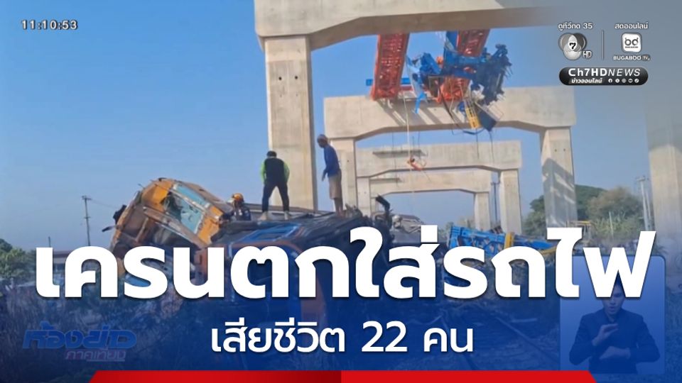ห้องข่าวภาคเที่ยง - รางยกชิ้นส่วนก่อสร้างรถไฟความเร็วสูงสายกรุงเทพฯ-นครราชสีมา ที่กำลังยกชิ้นส่วนขึ้นไปเกิดหลุดลงมา ทำให้รถไฟที่กำลังวิ่งผ่านมาพอดีชนเข้าอย่างแรง เบื้องต้นมีผู้เสียชีวิตแล้ว 7 คน