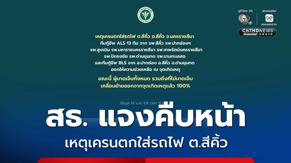 สธ. แจงคืบหน้า เหตุเครนตกใส่รถไฟ ต.สีคิ้ว จ.นครราชสีมา ผู้บาดเจ็บทั้งหมดรวมถึงที่ไม่บาดเจ็บ เคลื่อนย้ายออกจากจุดเกิดเหตุแล้ว 100%