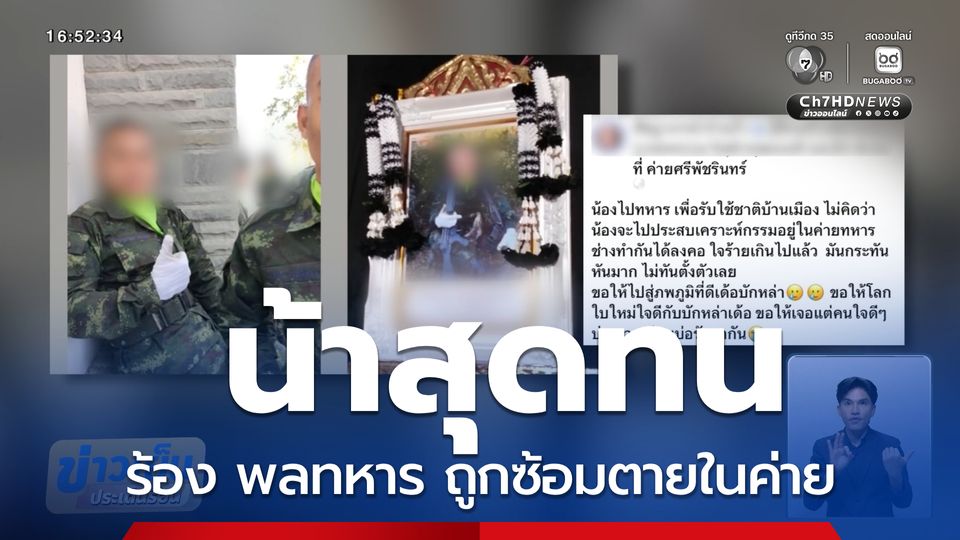 ข่าวเย็นประเด็นร้อน - น้าสาวสุดทน โพสต์เฟซบุ๊ก ทวงความยุติธรรมให้หลานชาย หลังไปเป็นทหารเกณฑ์ รับใช้ชาติ แต่ครูฝึกในค่ายทหารแห่งหนึ่งที่เมืองขอนแก่น ทำร้ายจนเสียชีวิต