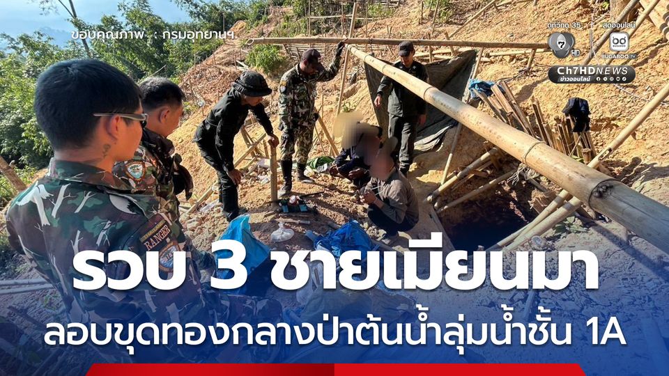 เจ้าหน้าที่อุทยานแห่งชาติทองผาภูมิ สนธิกำลังจับกุม 3 มอดไม้ สัญชาติเมียนมา ลักลอบขุดทองกลางป่าต้นน้ำลุ่มน้ำชั้น 1A ยึดของกลาง 11 รายการ หลังใช้เทคโนโลยีกล้องแจ้งเตือนอัตโนมัติซุ่มจับกุมกลางดึก
