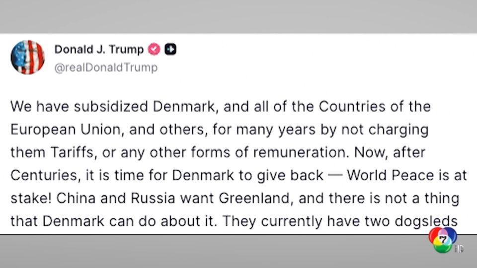 ประธานาธิบดีโดนัลด์ ทรัมป์ แห่งสหรัฐฯ โพสต์ข้อความผ่าน Truth Social วานนี้ (17 ม.ค.) ระบุว่า จะใช้มาตรการขึ้นภาษีนำเข้าสินค้าจากประเทศพันธมิตรในยุโรป จนกว่าสหรัฐฯ จะได้รับอนุญาตให้ซื้อเกาะกรีนแลนด์ เขตปกครองตนเองกึ่งอาณานิคมของเดนมาร์ก โดยขั้นต้นจะเก็บภาษีสินค้านำเข้าจาก เดนมาร์ก, นอร์เวย์, สวีเดน, ฝรั่งเศส, เยอรมนี, เนเธอร์แลนด์, ฟินแลนด์ และสหราชอาณาจักร เพิ่มเติมอีก 10% ตั้งแต่วันที่ 1 กุมภาพันธ์นี้ จากนั้นเมื่อถึงวันที่ 1 มิถุนายน จะเก็บภาษีสินค้านำเข้าจากทั้ง 8 ประเทศเพิ่มเติมอีก เป็น 25% และจะเพิ่มขึ้นต่อเนื่อง จนกว่าจะบรรลุข้อตกลงให้สหรัฐฯ ซื้อเกาะกรีนแลนด์ได้