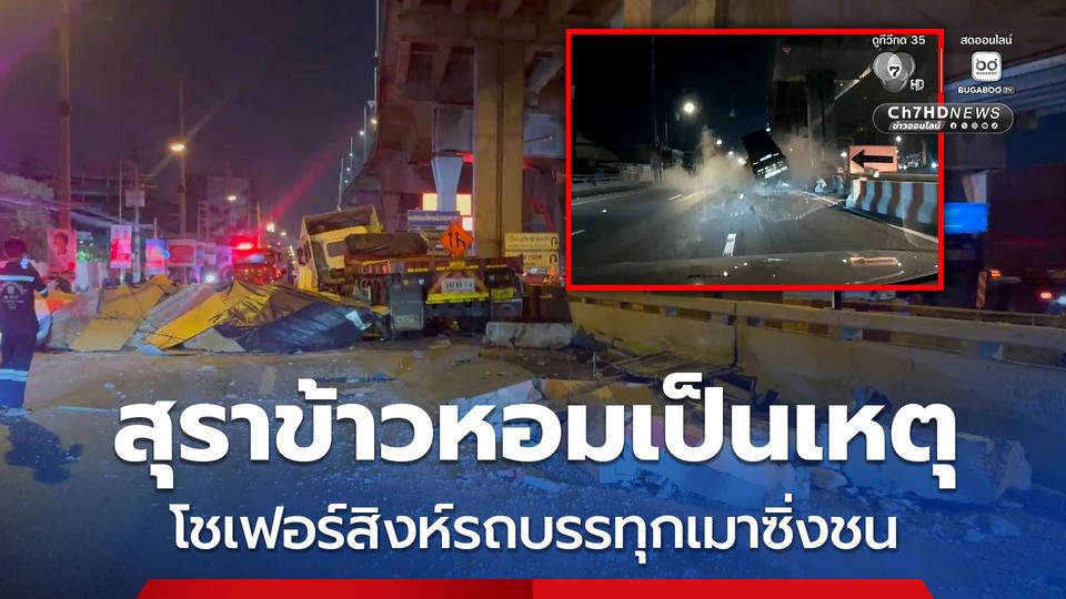 สุราข้าวหอม 40 ดีกรี เป็นเหตุ โชเฟอร์สิงห์รถบรรทุก เมาแล้วขับรถบรรทุกพ่วง ซิ่งปาดชนแนวก่อสร้าง ต้องปิดการจราจรเคลียร์นานกว่า 2 ชั่วโมง