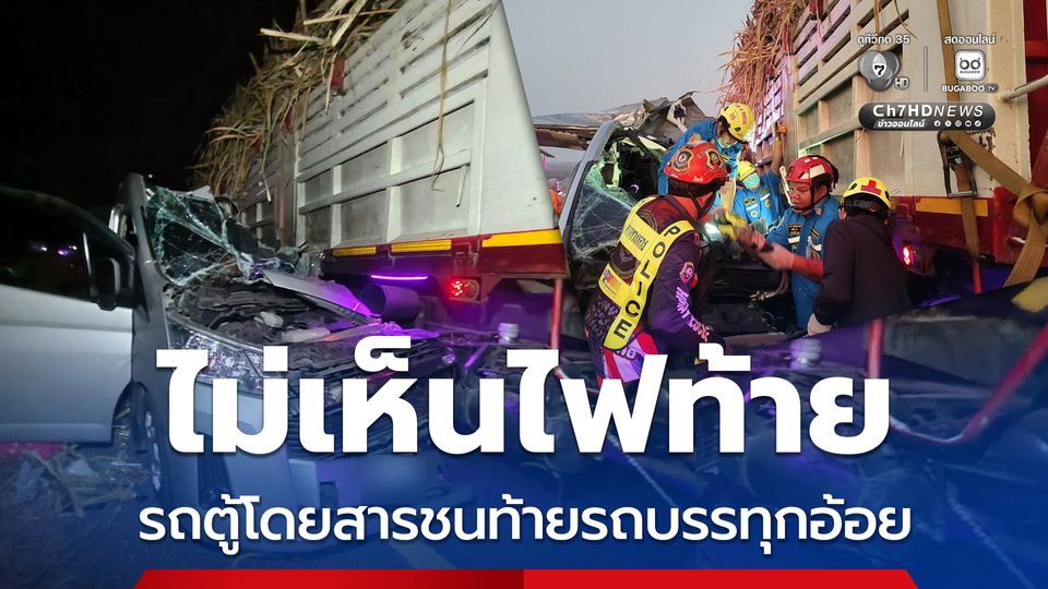 เกิดอุบัติเหตุรถตู้โดยสารชนท้ายรถบรรทุกอ้อย มีผู้ได้รับบาดเจ็บและติดภายใน กู้ภัยเร่งให้การช่วยเหลือนำเครื่องตัดถ่างงัดผู้บาดเจ็บ ออกมาเร่งนำส่ง รพ. คนขับรถตู้ เผย นำผู้โดยสารมาจาก กทม. และได้ส่งตามรายทาง ขณะเกิดอุบัติเหตุ เหลือผู้โดยสารในรถ 2 คน ระบุ ชนท้ายเพราะมองไม่เห็นไฟท้ายรถบรรทุกอ้อย
