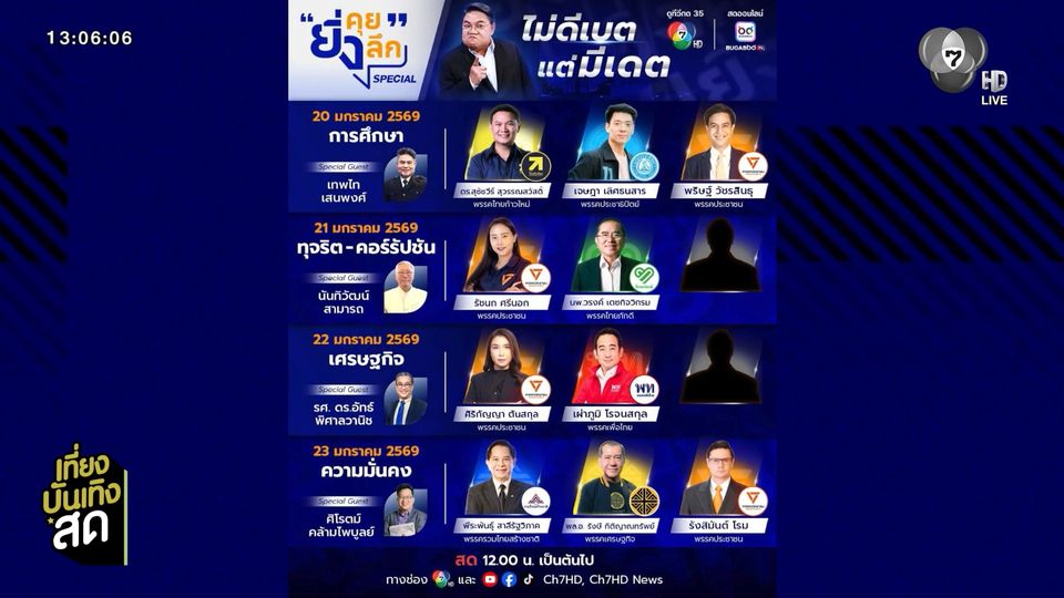เที่ยงบันเทิงสด - รายการ ยิ่งคุย ยิ่งลึก ตลอดสัปดาห์นี้ มีเรื่องพิเศษกับ "ยิ่งคุยยิ่งลึก SPECIAL ไม่ดีเบต แต่มีเดต" คุยเรื่องอนาคตประเทศไทย แบบมีความหวัง 4 เรื่อง 4 มุมมอง จากแขกรับเชิญ นักการเมืองพรรคต่าง ๆ เจอได้ทุกวันตลอดสัปดาห์ เวลา 12.00 น.