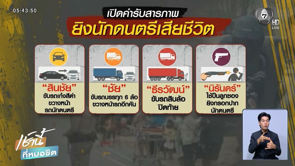 เช้านี้ที่หมอชิต - ในที่สุดตำรวจสามารถควบคุมตัวมือปืนยิงนักดนตรีชื่อดังของโคราช พร้อมลูกสมุน ได้เเล้ว สารภาพก่อเหตุเพราะเเค้น ขัดเเย้งเรื่องรับงานวงดนตรี