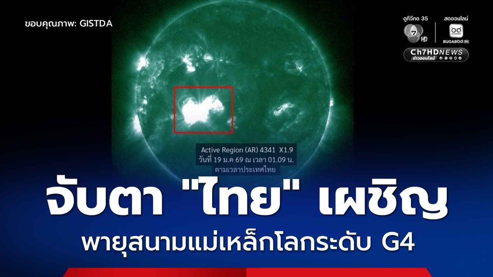 วันนี้ (20 ม.ค. 69) สำนักงานพัฒนาเทคโนโลยีอวกาศและภูมิสารสนเทศ (องค์การมหาชน) หรือ GISTDA รายงานสถานการณ์พายุสุริยะมาถึงโลกว่า เมื่อวานนี้ (19 ม.ค. 69) เวลา 01.09 น. ตามเวลาประเทศไทย เกิดการปะทุของ Solar Flare จากบริเวณ Active Region (AR) 4341 ตามรูปที่ 1 การปะทุครั้งนี้ไม่เพียงปลดปล่อยพลังงานรังสีในช่วงคลื่นต่าง ๆ ออกมาเท่านั้น แต่ยังเกิดการปลดปล่อยสสารร้อน (Plasma) และสนามแม่เหล็กออกจากดวงอาทิตย์ในรูปแบบของ Coronal Mass Ejection (CME) มีทิศทางพุ่งตรงมายังโลก ประกอบกับหลุมโคโรนา (Coronal hole) ที่ปล่อยลมสุริยะมาจากดวงอาทิตย์ ทำให้เกิดสนามแม่เหล็กโลกรุนแรง จากข้อมูลจากอวกาศและข้อมูลจากเครื่องวัดสนามแม่เหล็กโลก พบว่าไทยเผชิญพายุสนามแม่เหล็กโลกระดับ G4 ตามรูปที่ 5