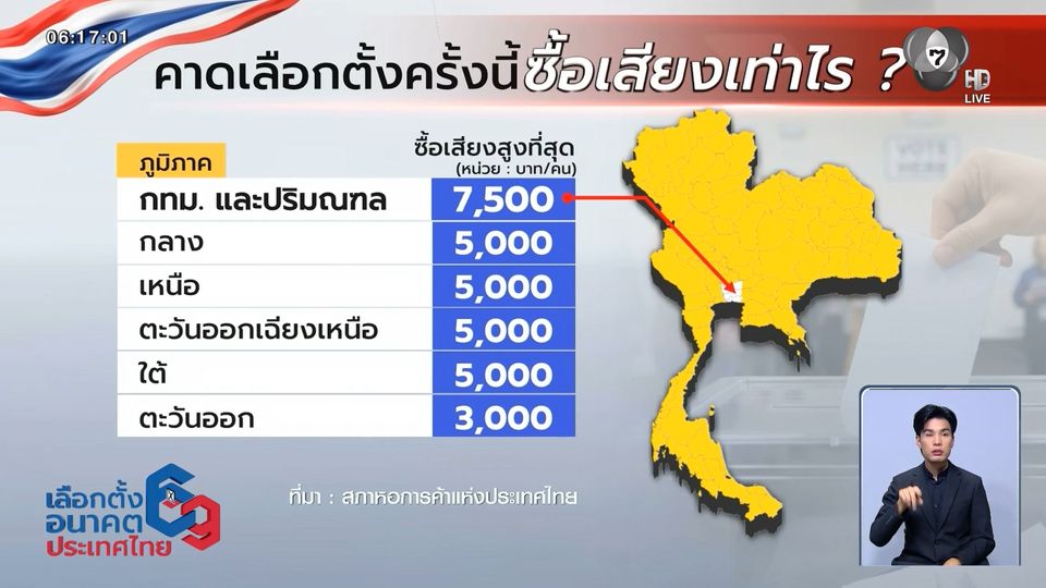 ส่วนราคาซื้อเสียงครั้งนี้ ค่าเฉลี่ยต่ำสุดและสูงสุด โดยกรุงเทพมหานครและปริมณฑล 3,000-7,500 บาทต่อคน ภาคกลาง ภาคเหนือ ภาคตะวันออกเฉียงเหนือ ภาคตะวันออก และภาคใต้ ตัวเลขจะอยู่ระหว่าง 1,000-3,000 บาทต่อคน