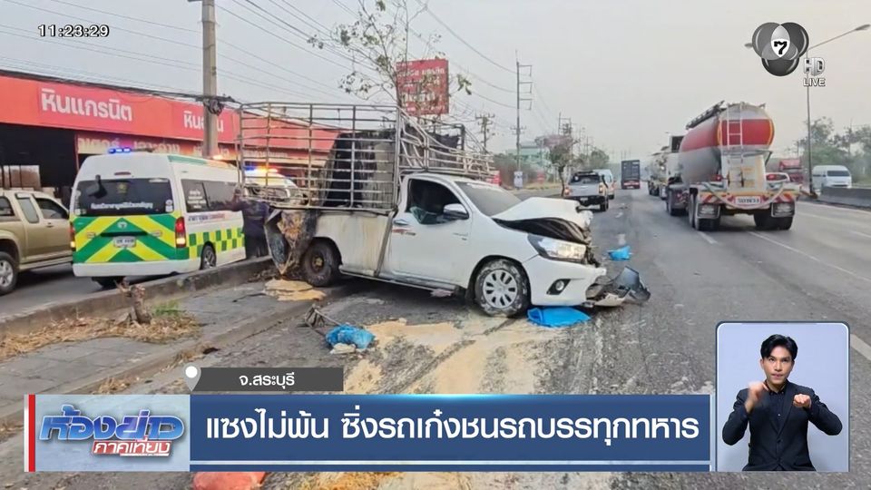 ห้องข่าวภาคเที่ยง - เกิดอุบัติเหตุทหารได้รับบาดเจ็บ 6 นาย บริเวณถนนมิตรภาพ ช่วงจังหวัดสระบุรี สาเหตุมาจากรถยนต์คันหนึ่งเร่งเครื่องแซงไม่พ้น