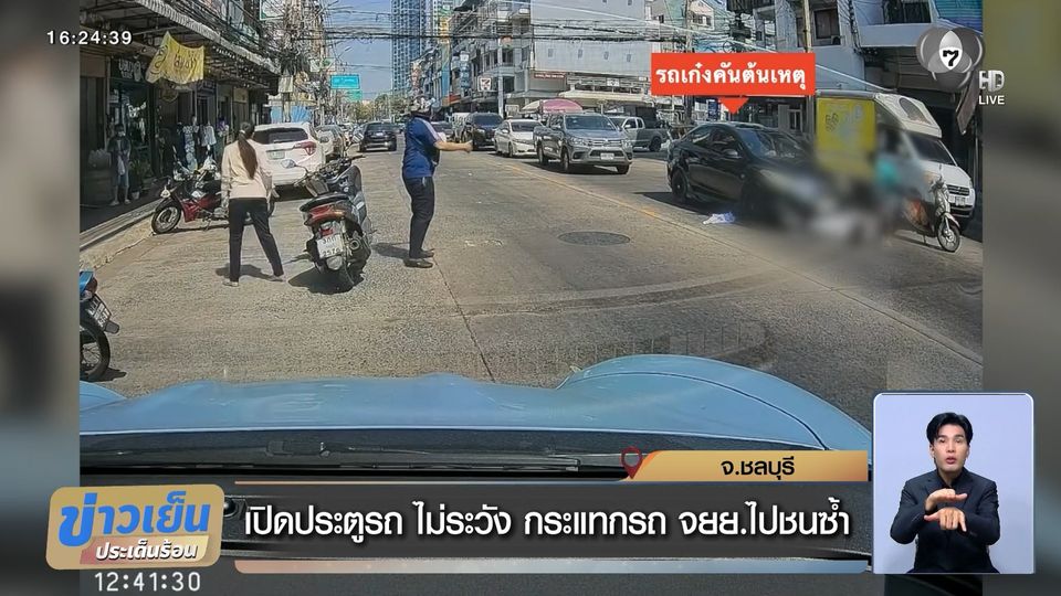 เปิดประตูรถ ไม่ระวัง กระแทกรถ จยย.ไปชนซ้ำ จ.ชลบุรี