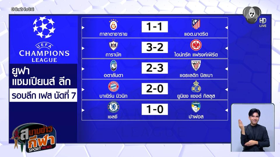 สนามข่าวกีฬา - ผลฟุตบอลยูฟา แชมเปียนส์ ลีก รอบลีกเฟส นัดที่ 7 คืนวันพุธที่ 21 มกราคม 2569