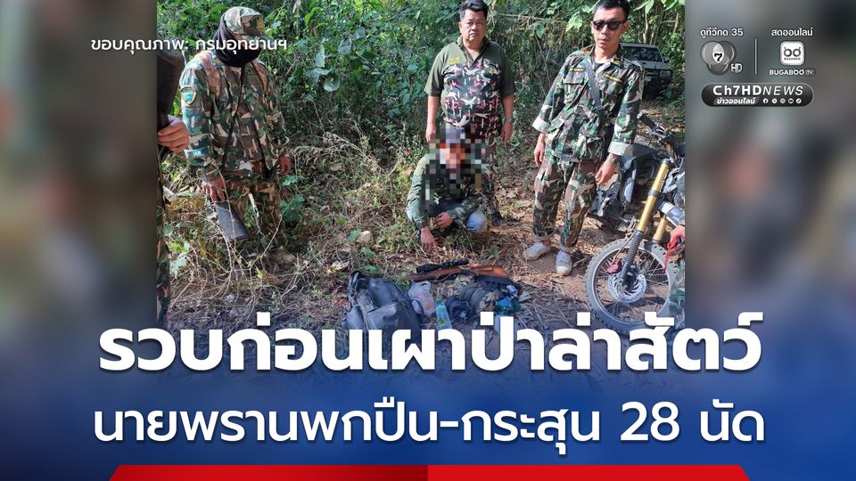 เจ้าหน้าที่อุทยานแห่งชาติเขื่อนศรีนครินทร์ รวบนายพรานพกปืน พร้อมกระสุน 28 นัด ขี่รถจักรยานยนต์ลอบเข้าพื้นที่อุทยานฯ สกัดแผน "เผาป่าล่าสัตว์"
