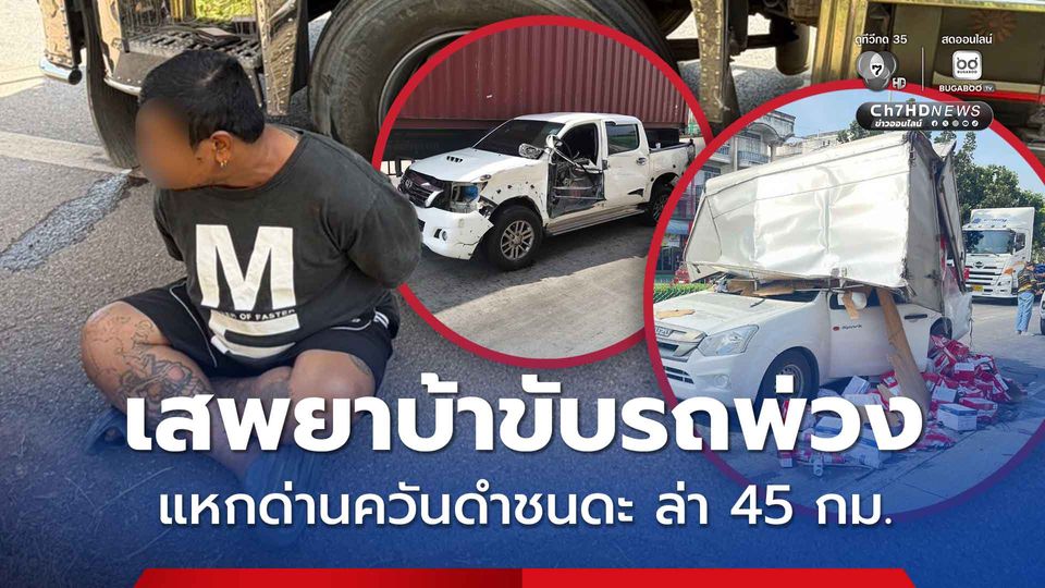 ไล่ล่าระทึก หนุ่มโชเฟอร์สิงห์รถบรรทุก เสพยาบ้าขับรถบรรทุกพ่วง 18 ล้อ แหกด่านตรวจควันดำ ชนดะรถจอดติดไฟแดง หนี 45 กิโลเมตร จนมุมที่ปราจีนบุรี พบมียาบ้าอีก 3 เม็ด