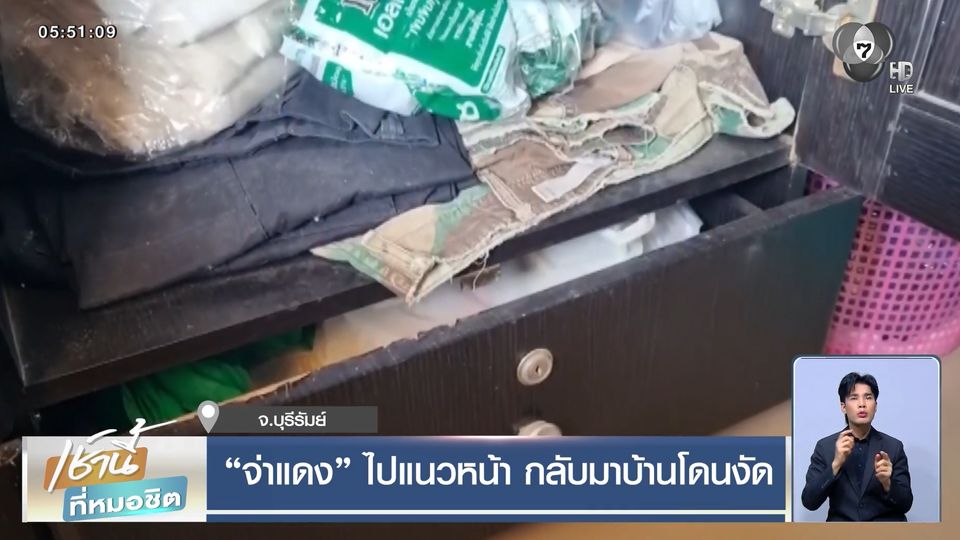 เช้านี้ที่หมอชิต - ที่จังหวัดบุรีรัมย์ "จ่าแดง" ทหารแนวหน้าวีรบุรุษที่ไปปกป้องอธิปไตยประจำการอยู่ชายแดน เข่าแทบทรุด กลับมาบ้านโดนงัด ขโมยพระเครื่องเก่า เตาแก๊ส แถมอุจจาระทิ้งไว้ให้ดูต่างหน้า