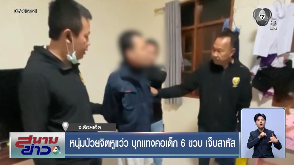 สนามข่าว 7 สี - ที่ จังหวัดร้อยเอ็ด เกิดเหตุสะเทือนขวัญ ชายป่วยจิตเวชอ้างหูแว่ว บุกใช้มีดแทงเด็กหญิง อายุ 6 ขวบ ในบ้านพักกลางชุมชน ตำรวจตามจับผู้ก่อเหตุได้ทันควัน