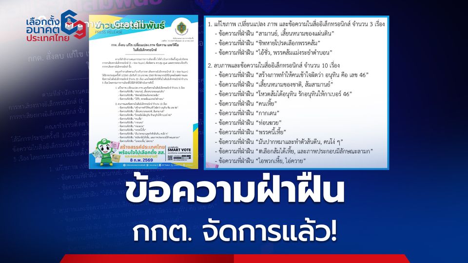 กกต. สั่งลบ แก้ไข ข้อความ และวิดีโอในสื่ออิเล็กทรอนิกส์ ที่ฝ่าฝืนลักษณะต้องห้ามหาเสียงเลือกตั้ง