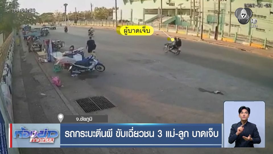 ห้องข่าวภาคเที่ยง - 3 เเม่ลูก ขี่รถจักรยานยนต์ กลับบ้าน ระหว่างทางถูกรถกระบะขับมาด้วยความเร็วเฉี่ยวชน จนทั้ง 3 คน กระเด็นไปคนละทิศ คนละทาง