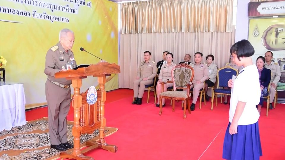 พลเอก บัณฑิตย์ มลายอริศูนย์ องคมนตรี กรรมการโครงการกองทุนการศึกษา ไปตรวจเยี่ยมการดำเนินงานของโรงเรียนในโครงการกองทุนการศึกษา และโรงเรียนเครือข่ายด้านคุณธรรม จริยธรรม ที่จังหวัดมุกดาหาร โดยช่วงเช้า ไปตรวจเยี่ยมโรงเรียนบ้านแก้งนาง อำเภอดงหลวง รับฟังรายงานผลการดำเนินงานของโรงเรียนฯ ซึ่งเป็นโรงเรียนในพื้นที่ห่างไกล ทุรกันดาร มีสภาพภูมิประเทศเป็นภูเขา การคมนาคมไม่สะดวก โรงเรียนฯ ได้น้อมนำแนวทางตามโครงการกองทุนการศึกษาไปใช้ในการพัฒนาคุณภาพการศึกษา การส่งเสริมคุณธรรม จริยธรรม การดูแลนักเรียนทุนพระราชทาน และการพัฒนาครูและบุคลากรทางการศึกษา เพื่อสร้างโอกาสทางการศึกษาอย่างยั่งยืน