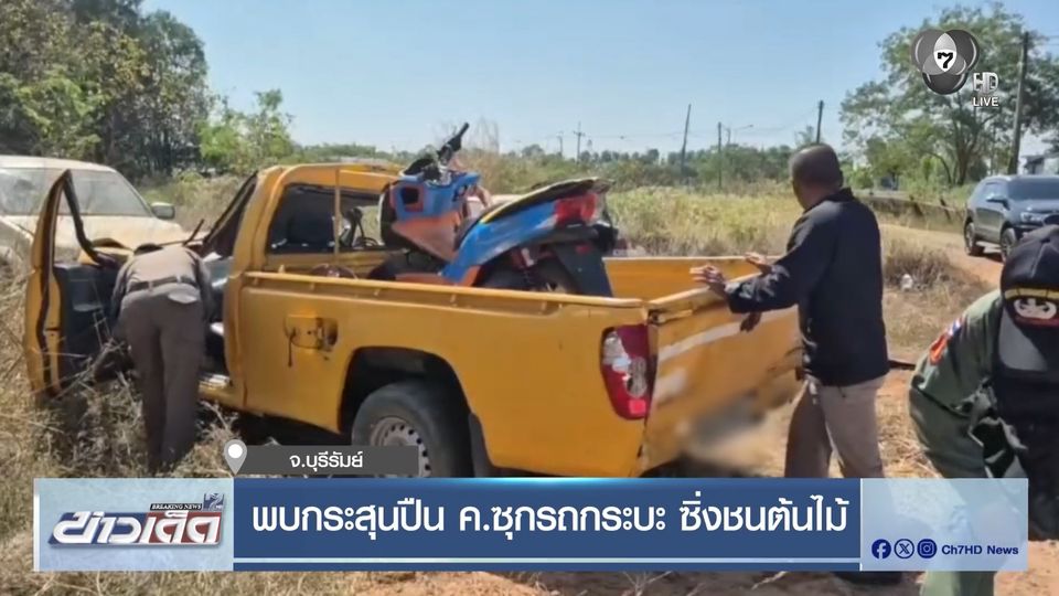 ข่าวเด็ด 7 สี - ที่จังหวัดบุรีรัมย์ หนุ่มขับรถกระบะหลับในพุ่งชนต้นไม้อาการสาหัส เจ้าหน้าที่ผงะเจอกระสุนปืน ค. และประทัดยักษ์ เต็มรถ