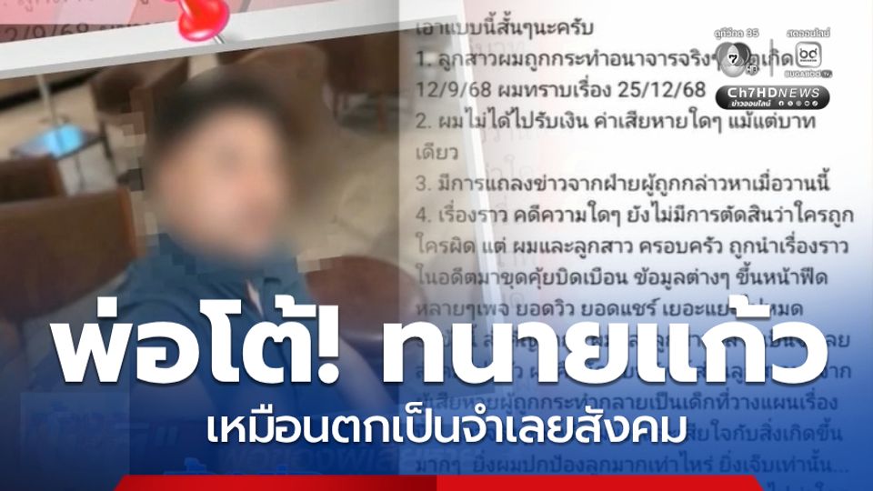 ห้องข่าวภาคเที่ยง สุดสัปดาห์ - "ทนายแก้ว" ชี้แจงในมุมของตัวเองเสร็จแล้ว ก็ถึงคราวฝั่งของ "โชติ" พ่อของหญิงผู้เสียหาย ที่ออกมายืนยันในฝั่งของตัวเองเช่นกัน ว่าคู่กรณีกระทำอนาจารลูกสาวของเขาจริง ๆ