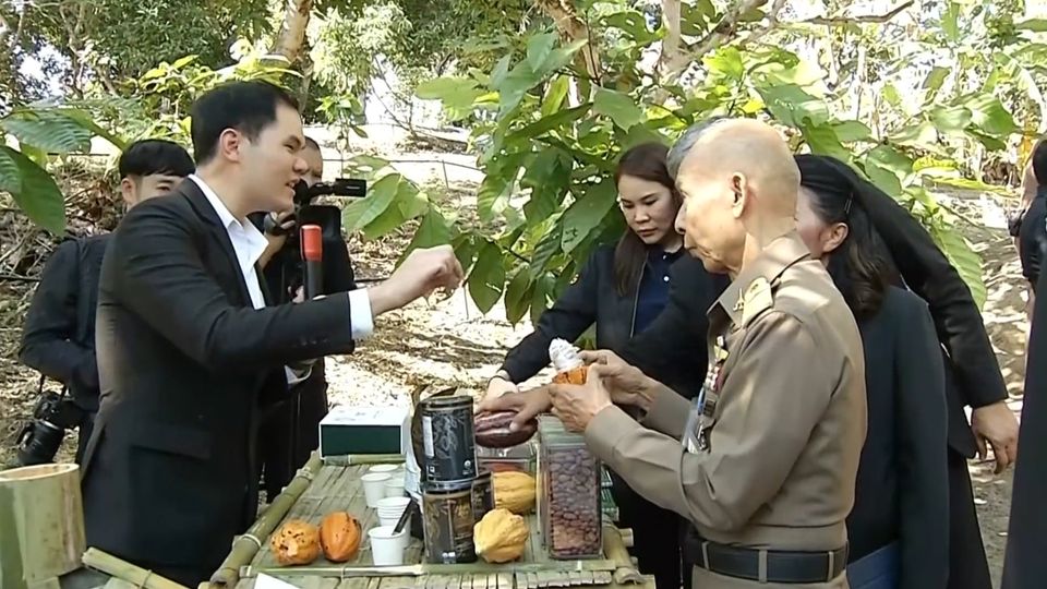 ช่วงบ่าย ไปเยี่ยมชมแปลงเกษตร ของนายสมชาติ กุนา เกษตรกรในพื้นที่โครงการร้อยใจรักษ์ ณ บ้านเมืองงามใต้ อำเภอแม่อาย ซึ่งเป็นแปลงริเริ่มทดสอบการปลูกโกโก้สายพันธุ์ im1 ซึ่งเป็นพืชระยะยาวปลูกใต้ร่มเงาไม้ใหญ่ร่วมกับพืชชนิดเดิม ทั้งยังมีราคาสูง นำไปแปรรูปเป็นผลิตภัณฑ์อื่น ๆ ได้หลากหลาย อาทิ ผงโกโก้ชงดื่ม และขนมช็อกโกแลต